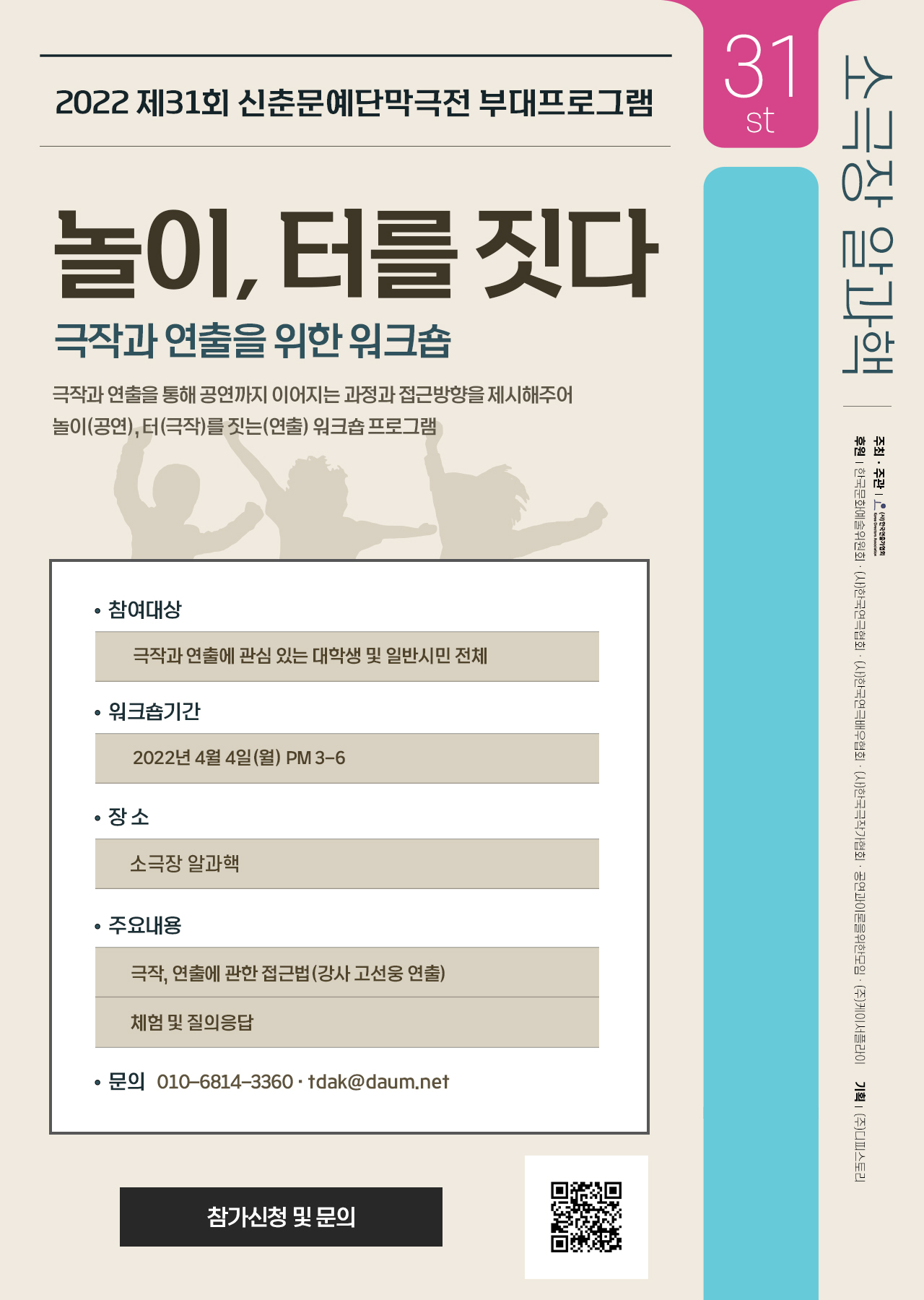 신춘문예 단막극전 부대프로그램으로 '놀이, 터를 짓다 - 극작과 연출을 위한 워크숍'이 무료로 열려 알려드립니다. 많은 관심 부탁드립니다. 감사합니다. 무료 예약 링크 - https://forms.gle/LuRT9fpMvnqb8Gw7A |