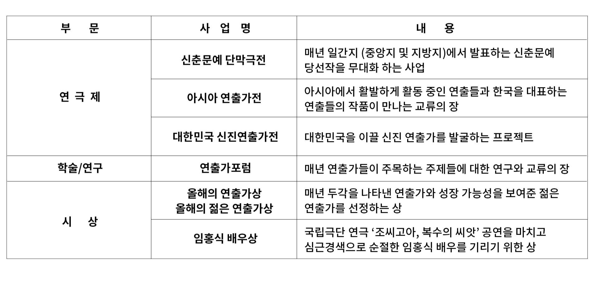 매년 <신춘문예 단막극전>, <아시아 연출가전>, <연출가 포럼>, <대한민국 신진연출가전>을 주최하고 있으며,